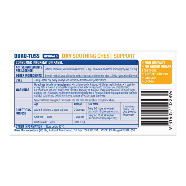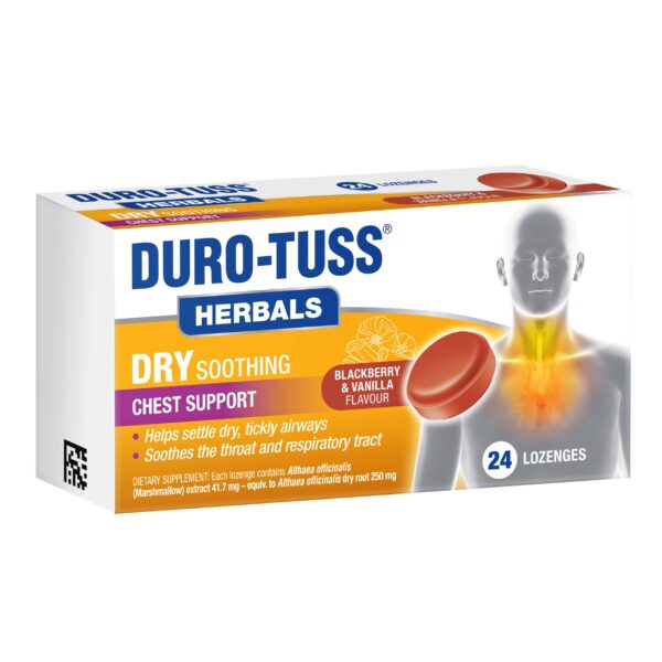 DURO-TUSS HERBALS DRY SOOTHING CHEST SUPPORT LOZENGES contain Althaea officinalis (Marshmallow) extract. It’s herbal formulation helps settle dry, tickly airways and soothes the throat and respiratory tract.